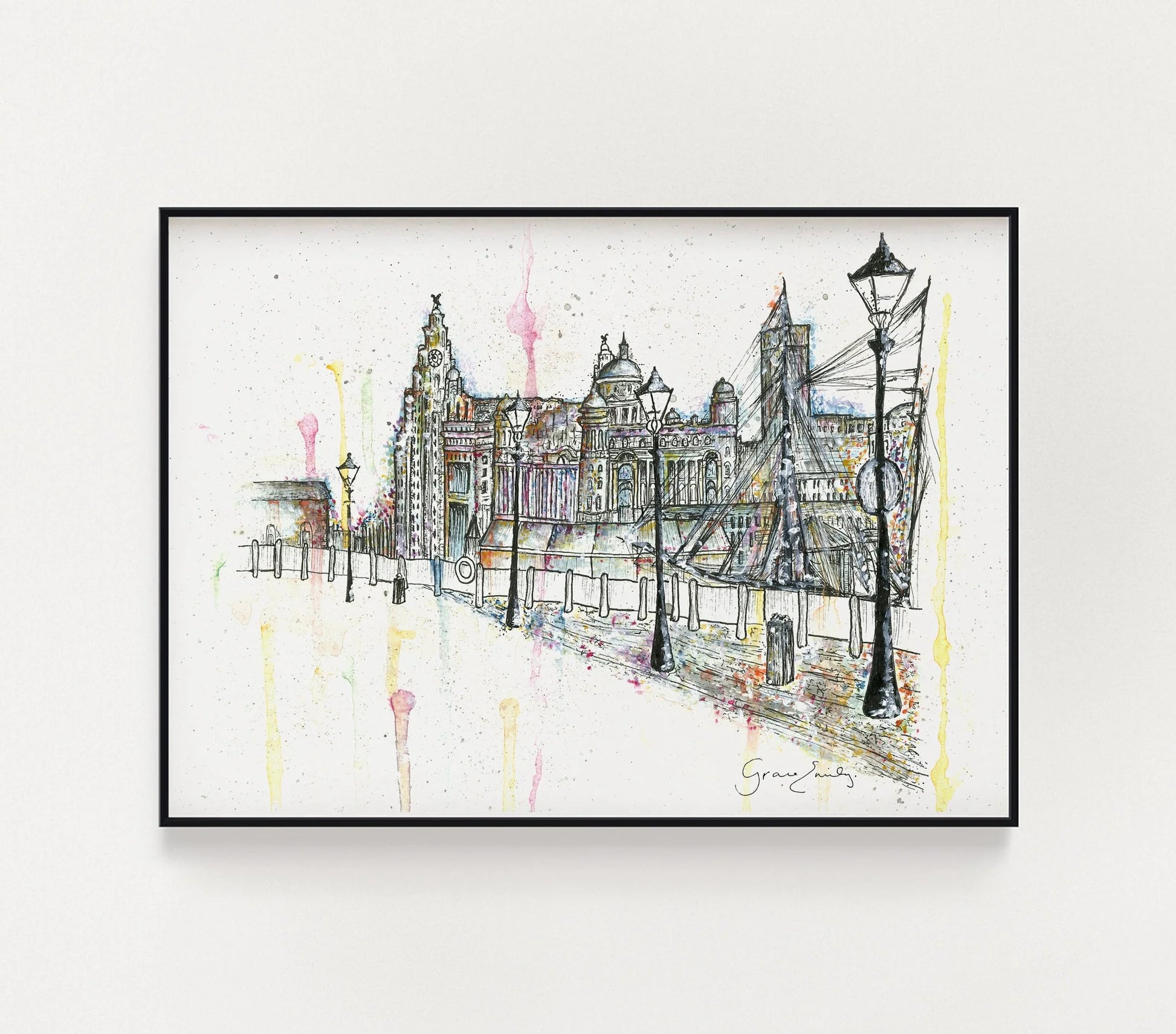 A mixed media print of my illustration of the Albert Dock in Liverpool by Grace Emily Design.