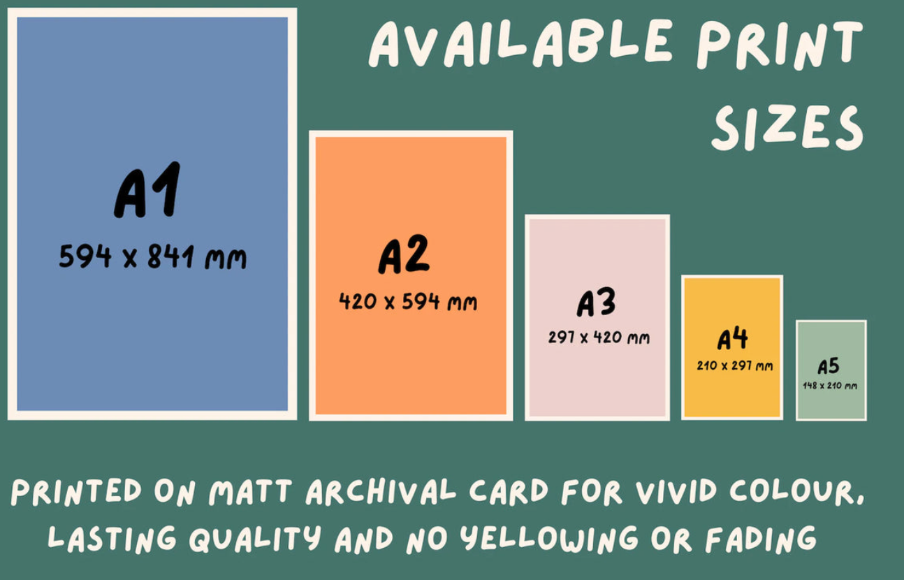 All artwork is professionally printed onto smooth fine art Archival 230gsm matt card with vivid colour and detail.