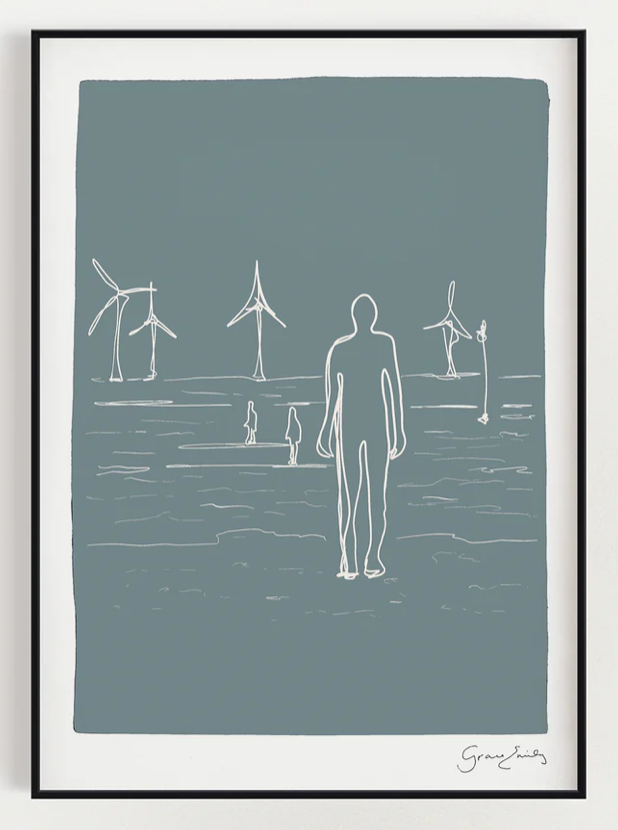 A contemporary illustration of Anthony Gormley's 'Another Place' sculptures on Crosby Beach in Liverpool by Grace Emily Design.