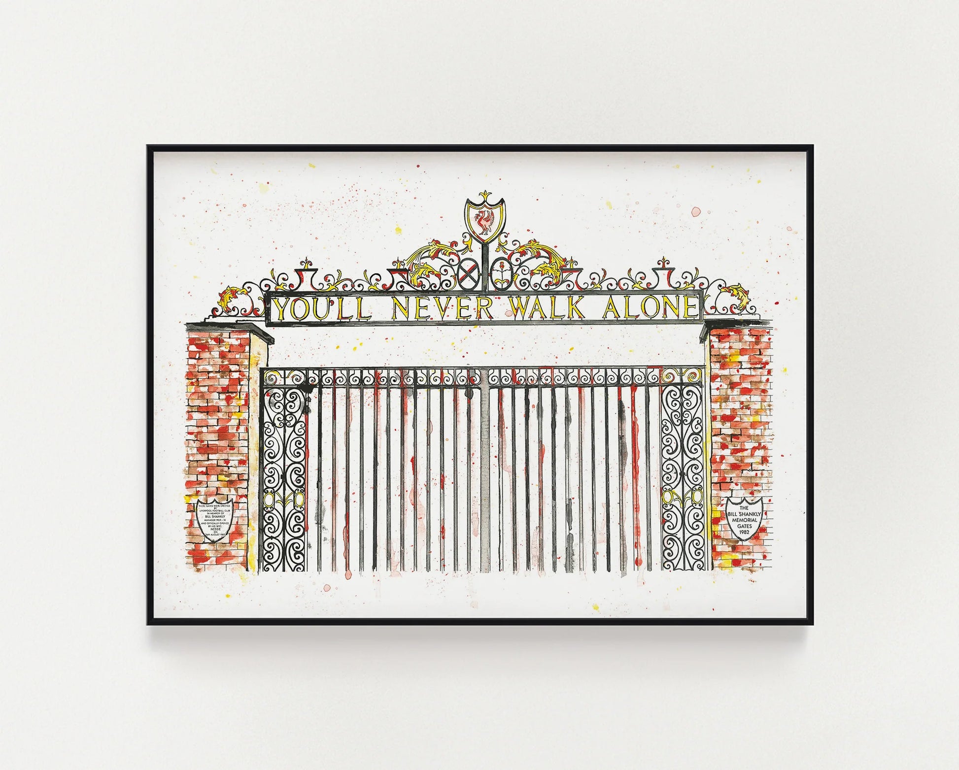 Liverpool Football Club’s iconic Shankly gates. Created with ink, watercolour paint and edited digitally then printed locally onto high quality fsc certified card.