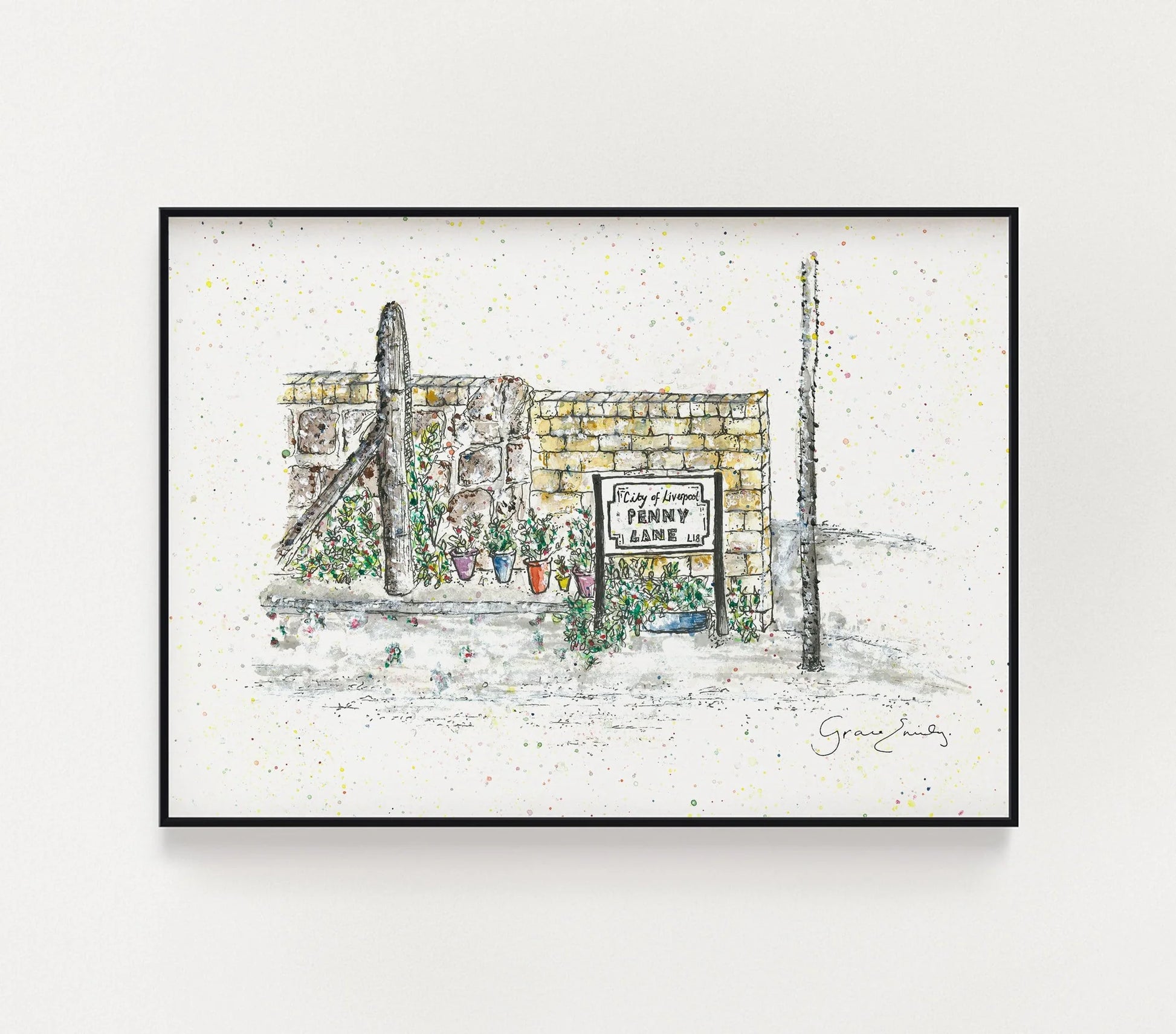 A mixed media print of Penny Lane in Liverpool by Grace Emily Designs.