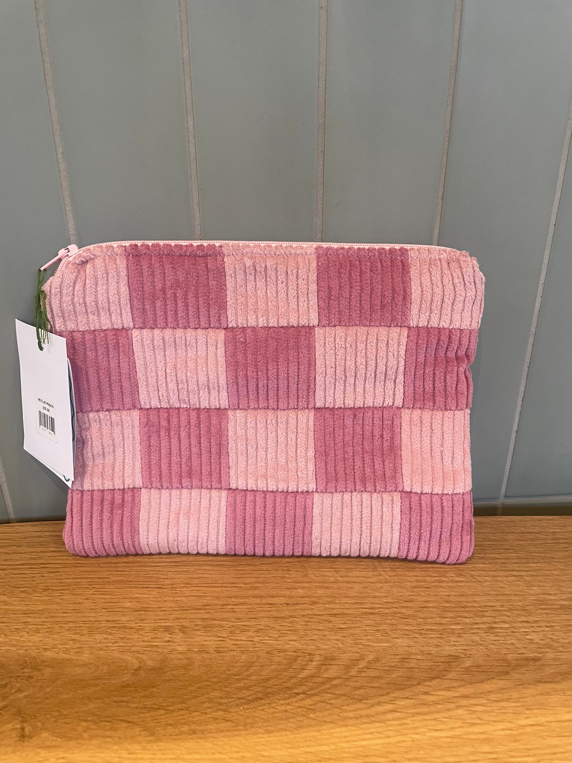 Handmade large pouch, made from 40 squares beautifully soft corduroy fabric, patchworked together to create the unique checkerboard design. Each pouch is quilted and lined with a co-ordinating cotton fabric, with a zip closure.