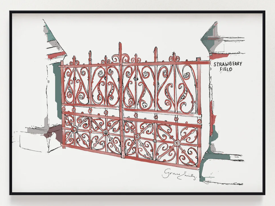 A mixed media print of Strawberry Fields in Liverpool by Grace Emily Design.