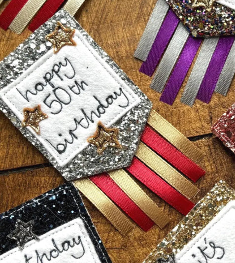 Each badge is made from a chunky glitter felt. We then add coloured ribbon and a metal pin on the back to finish.