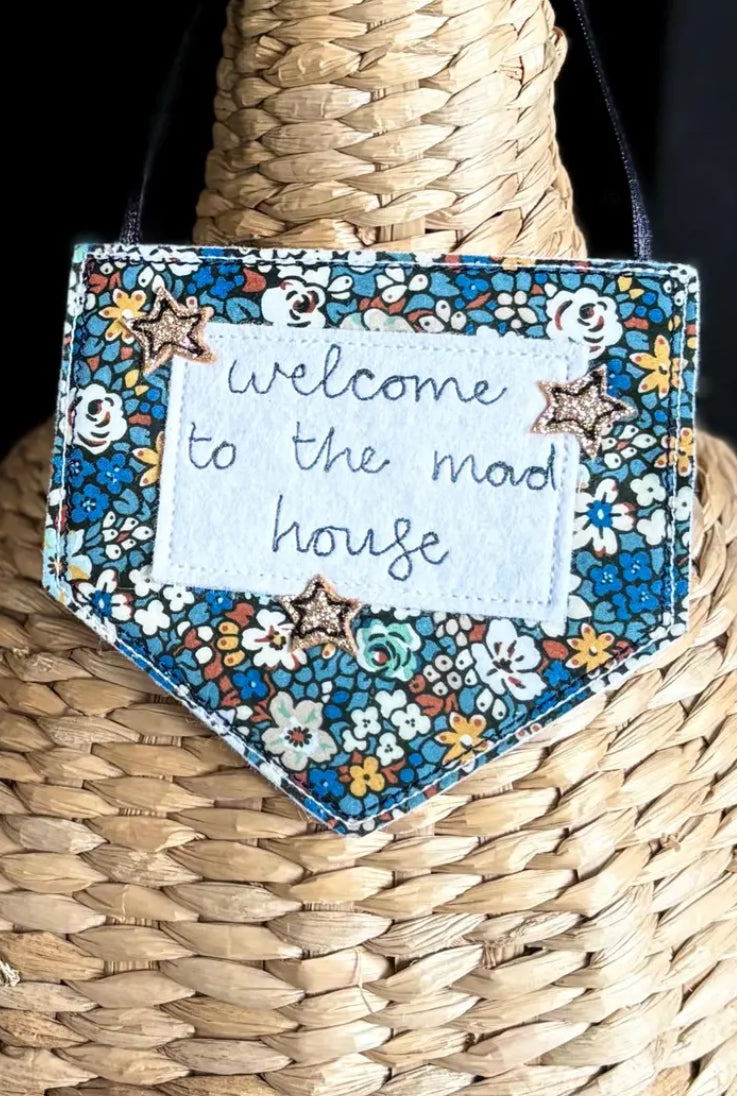 Our pennant signs are made from gorgeous Liberty fabric to finish we add some little glitter stars for a touch of sparkle.